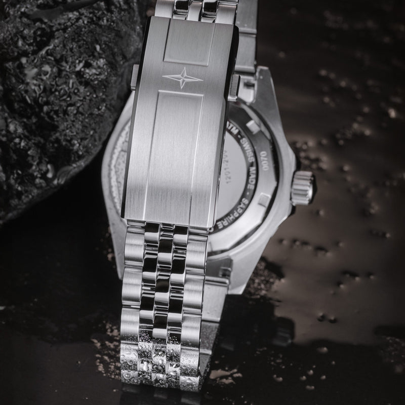 Edelstahl 316L erfüllt die höchsten Ansprüche: er ist sehr hart, widerstandsfähig und daher der optimale Werkstoff für Uhrengehäuse und Armbänder. Seine Ursprünge hat der sogenannte Chirurgenstahl in der Medizin und ist dort das Material der Wahl. Durch die hohe Strapazierfähigkeit, Korrosionsbeständigkeit und antimagnetischen sowie antiallergenen Eigenschaften ist er in der Uhrenwelt unverzichtbar geworden.