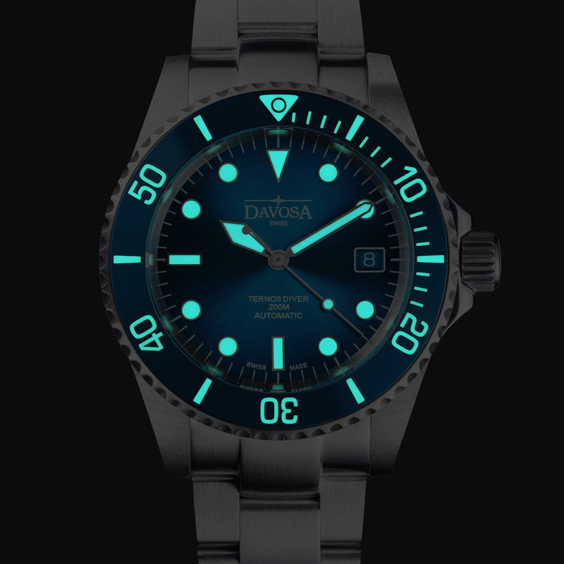 Die komplette blaue HighTech Keramiklünette, handapplizierten Indexe und Zeiger sind mit Super‑LumiNova® in einer speziellen hellblauen Sonderfarbe versehen, sodass die Blauabstufungen des Zifferblatts auch im Dunkeln sichtbar bleiben.