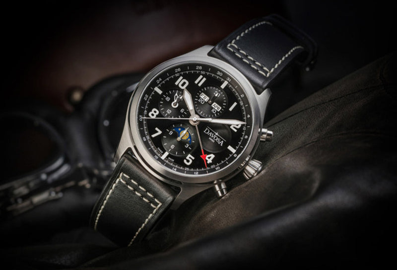 限量300枚的牛顿飞行员月相计时码表在9点钟位置设有数字铭牌,是全新推出的“牛顿飞行员”系列的旗舰。基于 ETA/Valjoux 7751 的 DAV 3051 是工作中最复杂的计时机芯之一:自动机芯显示小时、分钟和秒。它具有秒表功能、月相显示和指针式日期——以红色飞机剪影作为指针尖端,星期、月份和时间也以 24 小时制显示。这只是功能!这里安装的顶级版本也以最精致的装饰给人留下深刻印象,从带有珍珠饰面或“Côte Circulaire”、蓝钢螺丝和镀铑的桥板开始,一直到新设计的、带日内瓦条纹的最大镂空DAVOSA摆陀。