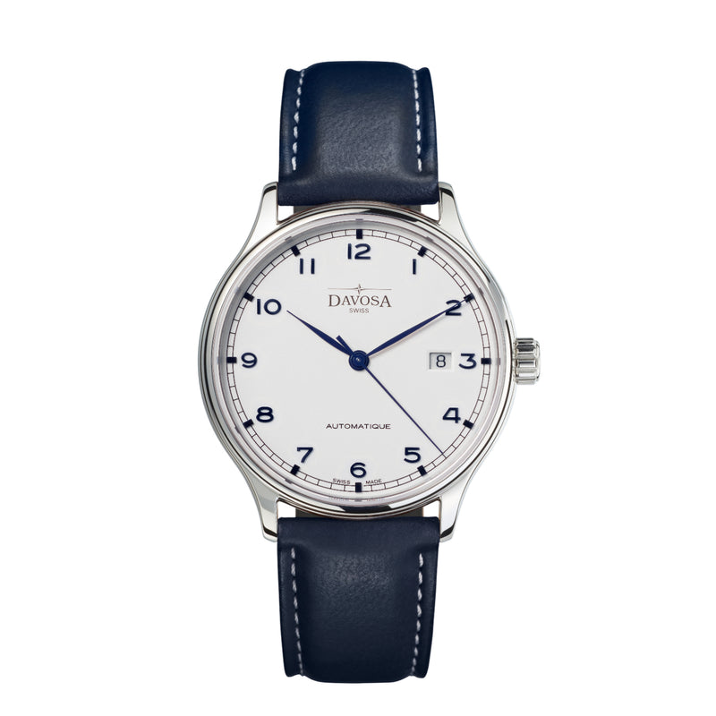 蓝色牛皮表带采用白色对比缝线以及针扣,22 毫米的宽度可以搭配 Newton Pilot、Pilot Chronograph、Ternos Professional、Military、Simplex、Heritage Quartz、Vintage Rallye Pilot 等款式。凸耳宽度: